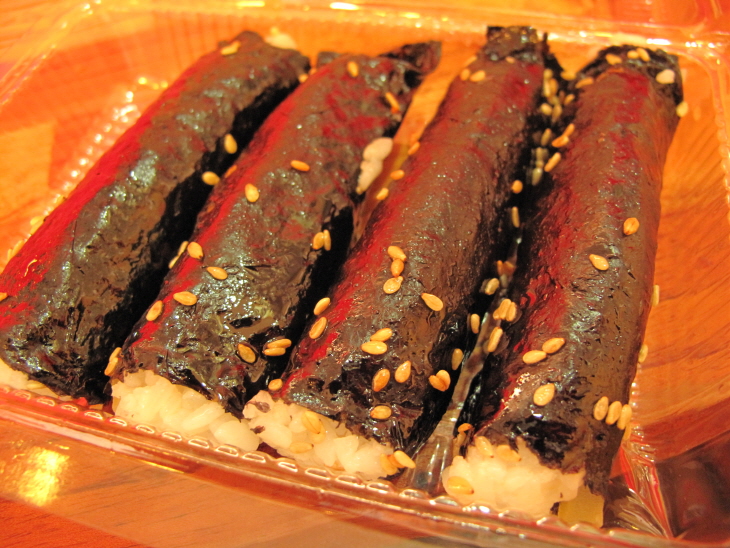 먹거리 골목 중앙에 집게손가락 크기의 마약김밥이 피라미드처럼 쌓여있다. 겉모습은 충무 김밥과 비슷하다. 충무김밥의 속 재료는 오직 밥만 들어가고 먹을 때 무김치, 오징어 김치와 함께 먹는 것이 특징이다. 마약김밥은 흰 쌀밥 위에 단무지, 시금치, 당근이 들어간다. 마약김밥이란 강력한 단어처럼 특별한 재료가 들어갈 것이라는 생각했지만 일반 가정에서 먹는 김밥과 재료의 차이가 없다. 대신 꼭 겨자 소스에 찍어 먹어야 마약김밥을 먹었다고 할 수 있다. 분식도 함께 파는 곳도 많으니 떡볶이 국물에 찍어 먹는 것도 맛있게 먹는 방법 중 하나다.