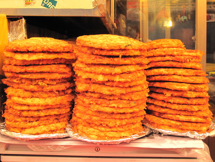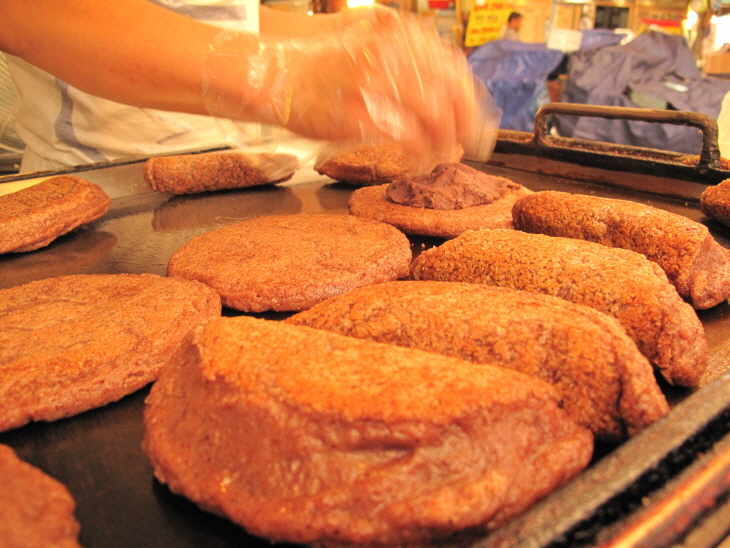 시장에서 먹는 음식 중 번호표를 받아 기다리는 곳이 몇이나 될까. 이름도 생소한 수수부꾸미는 일단 먹으려면 번호표를 받고 대기를 해야 할 만큼 광장시장에서 유명한 먹거리다. 수수부꾸미는 만두와 비슷한 모양을 하고 있지만 만드는 방법과 재료가 다르다. 찹쌀가루와 찰수수가루를 넣어 반죽하고 쫀득한 반죽을 호떡처럼 둥글게 펴 그 위에 팥을 올린 뒤 반으로 접어 번철에 굽는다. 겉은 바삭하고 속은 부드러운 팥의 달콤함은 간식으로 먹기 안성맞춤이다.