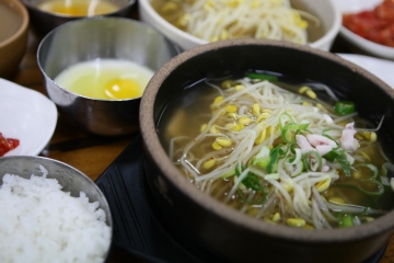 날계란을 풀어 먹는 전주 콩나물국밥은 독특하면서도 정감 넘치는 맛을 가지고 있다.고기 맛이 그대로 살아 있는 쇠고기 국밥을 맛보고 싶다면 역시 우시장 인근의 국밥 집을 찾는 것이 좋은데, 트래블투데이에서는 경상남도 함안군의 한우국밥을 추천한다. 도항동 우시장에서 공급받은 쇠고기와 선지가 따라잡기 힘든 신선한 맛을 선사해 줄 것이니 말이다. 국밥에 대해 이야기 할 때 전북 전주시의 콩나물국밥 이야기를 빼는 것은 예의가 아닐 것이다. 100여 년의 역사를 가진 전주의 콩나물국밥은 날계란을 넣어 먹는 것이 가장 큰 특징이다.