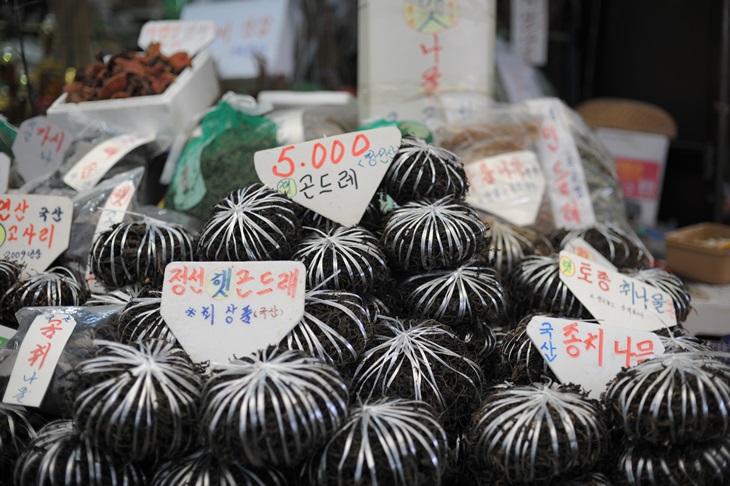 정선아리랑시장에는 소박한 시골장 냄새가 정겨운 먹거리가 많은데, 그 중에도 말린 곤드레는 인기 만점이다.