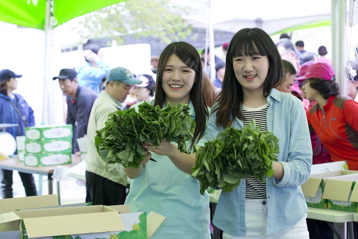 강원도 인제 진동계곡산나물축제에 손을 보태는 소녀들. 손에 든 봄나물처럼 싱그러운 미소다.