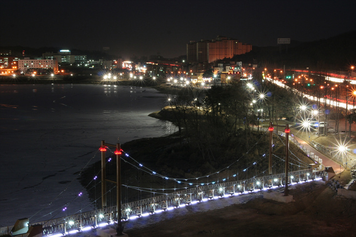 좋은 음악을 틀어놓고 애써 분위기를 잡지 않아도, 일단 한번 어둠이 깔리고 나면 천호지는 그 자체로 로맨틱한 모습이다. 해가 지고 달이 뜨는 서편을 향해 서 있는 카페에는 이 낭만을 즐기기 위해 나온 연인들로 가득하다. 잔잔하게 흐르는 물결 위로 반짝이는 불빛이 쉼 없이 수놓는 밤. 반짝반짝 빛나는 천호지의 밤은 두 손 맞잡은 연인들의 애정과 함께 깊어만 간다.