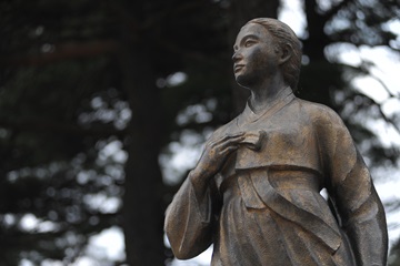정선 아리랑으로 승화된 애절한 전설의 주인공 아우라지 처녀상이 강 건너를 바라본다.2