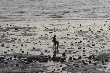 물길이 드러나기 시작한 갯벌에서 추억을 새기고 있는 가족의 모습