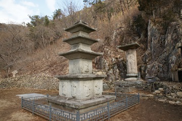 보물 제945호 금둔사지 삼층석탑. 뒤편으로 석불비상이 보인다.