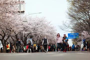 영등포 여의도 봄꽃축제에 참여한 사람들이 벚꽃 길을 거닐고 있다