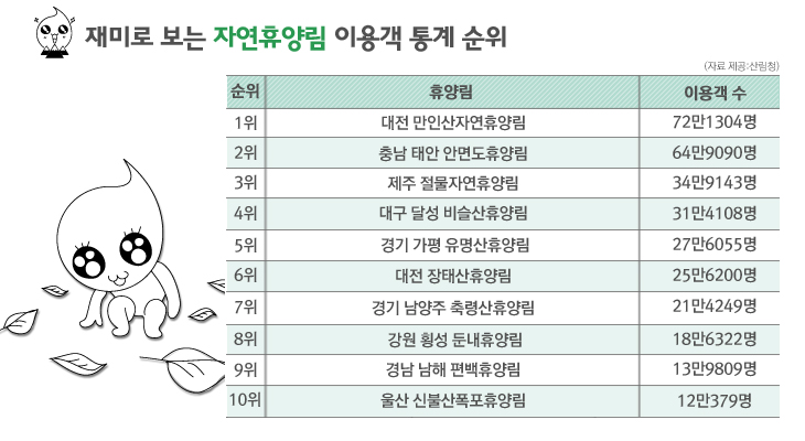 먼 옛날, 우리나라 땅을 처음 밟아 보았던 한 프랑스인은 ‘조선은 산의 나라’라는 소감을 전했다 한다. 삼천리 가득히 금수강산이 펼쳐져 있는 모습은 이 땅에서 나고 자란 우리에게만 일상의 풍경으로 보이는 것일지도 모른다. 지금은 반쪽짜리임에도 이 ‘산의 나라’에는 120여 개의 자연휴양림이 있다. ‘올해’의 자연휴양림이 아닌 휴양객들의 자연휴양림. 그 순위를 확인해 보시라. 올해부터는 자연휴양림 내에서 모노레일을 타거나 로프 체험을 할 수 있게 된다는 소식이 들려오니, 봄날이 가더라도 계속 자연휴양림을 주시하는 것이 좋겠다.