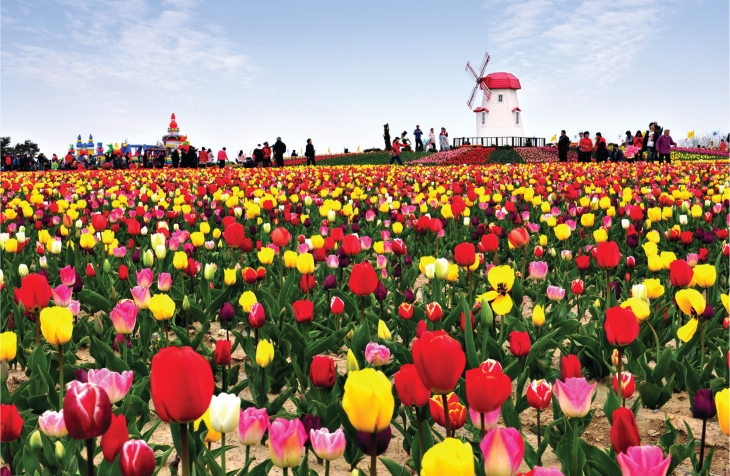화려한 튤립들, 그리고 그 가운데 선 빨간 풍차의 모습이 매력적이다.