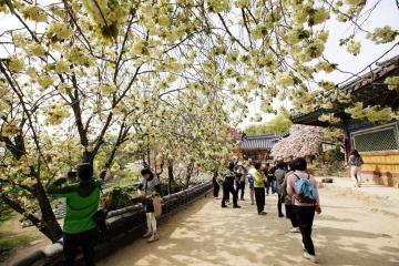 그런데 이 겹벚꽃이 모양만 화려한 게 아니다. 개심사에 피는 겹벚꽃은 5가지 색이다. 덜 익은 청포도 빛을 띠는 청벚꽃, 연분홍벚꽃, 그리고 진분홍·분홍·흰 벚꽃……. 모양에 놀라고 색에 감탄한 불자(佛子)들 사이에서 개심사 벚꽃은 오랜 세월을 거쳐 회자되었고, 이제는 불교 신자가 아닌 관광객들의 발걸음까지 붙들고 있다.