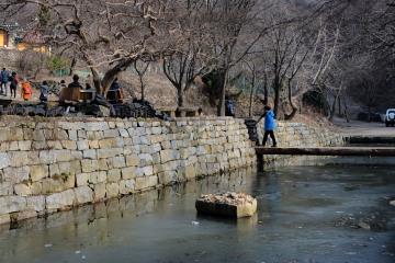 개심사 대웅전 올라가는 길목에 외나무다리가 있다.