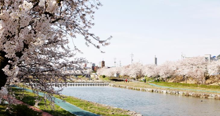 4월 봄꽃축제의 ‘베스트셀러’, 벚꽃을 서산에서 보고 싶다면? 겹벚꽃이 아무리 예뻐도 등산은 부담스럽거나, 고택에 찾아갈 만큼 부지런(?)하지 않은… 말하자면 조금 ‘게으른’ 여행자들이라면 서산 해미천을 추천한다. 4월에는 해미천 벚꽃이 만개하는 모습을 볼 수 있다. 천변 꽃길인 만큼 길은 가파르지 않다. 걷기 좋은 이 길의 벚꽃 거리는 총 약 2.2km. 슬렁슬렁 걸어도 1시간이 채 안 되고, 파워워킹 하면 30분도 안 걸리는 거리다. 평균 걸음으로 30분 쯤 걷다보면 시리도록 하얀 벚꽃 비를 흠뻑 맞을 수 있다.