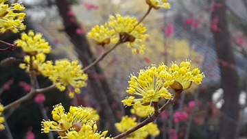 긴 꽃잎이 각각 뻗어있고 털이 난 산수유꽃. 사람이 사는 곳에 잘 자란다.