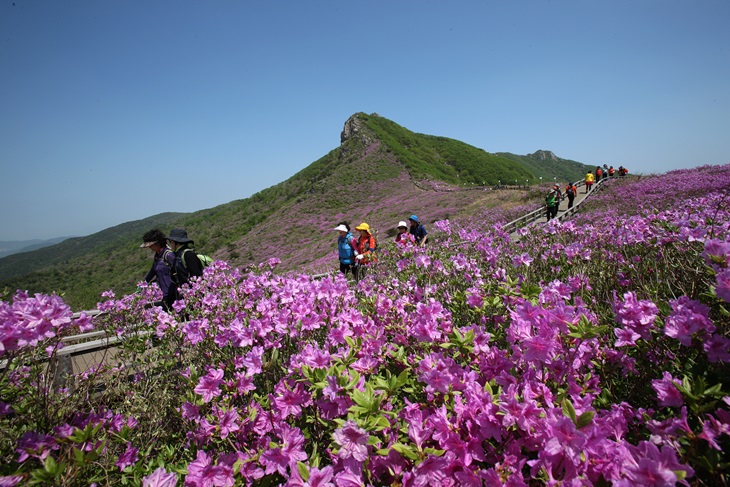 철쭉이 만개하는 합천 황매산 고원. 화사한 철쭉과 완연한 봄을 즐길 수 있다.