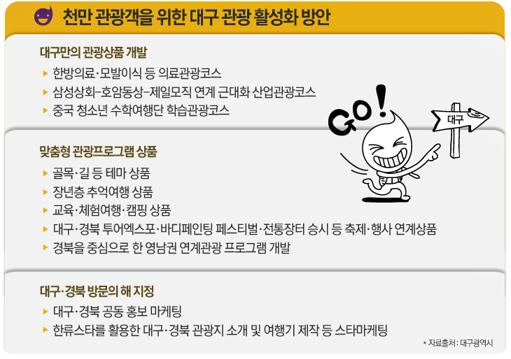 대구광역시가 채택한 전략은 빛깔을 다양히 할 것, 그리고 그 빛깔마다 보다 강한 색을 입힐 것. 곧 내실 있는 관광 인프라의 확충이라 할 수 있겠다. 일례로 대구광역시가 제공하는 대구 대표 명품 관광코스와 시티투어 버스의 프로그램을 살펴보자. 촘촘히 짜여진 일정과 동선을 예상했다면 대구광역시에 대한 이해가 아직은 조금 부족한 것이라 할 수 있겠다.