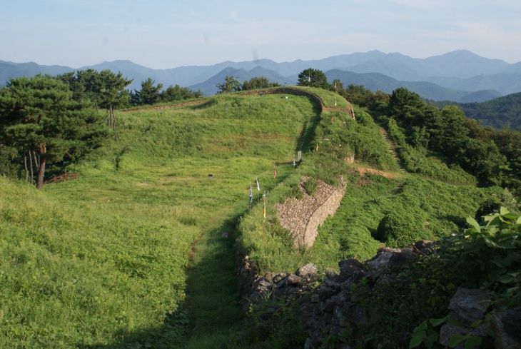 해발 208.9m의 마로산성은 백제시대에 처음 축조돼 통일신라시대에 활발히 활용된 고대 성곽으로, 군사적 기능을 넘어 행정·교통·종교 기능이 결합된 복합 유적이다. 이름에 ‘馬(말)’자가 포함된 마로산성은 정상부를 중심으로 성벽을 둘러싼 테뫼식 산성으로, 가장자리는 높고 중앙은 낮아 말안장을 닮은 ‘마안봉(馬鞍峰)’ 지형을 이룬다.