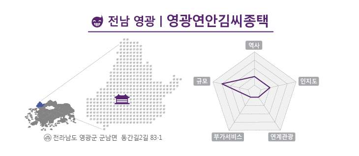 마을 어귀에 놓인 아름드리 소나무를 주변으로 한들거리는 바람에 절로 눈이 감긴다. 온 초목이 울긋불긋 물드는 가을도 좋지만 한옥의 진가를 경험하는 데에는 여름도, 겨울도 언제나 좋다. 한적한 시골풍경을 감상하는 것도 잠시 아담하고 귀여운 담장 옆으로 높이 솟은 누각이 멀리서부터 시선을 끈다. 당장에 그 규모가 실감나지 않지만 몇 채의 기와지붕이 각자의 자리에 솟아오른 곳 입구에는 비로소 연안김씨종택이 자리하고 있다. 산 아래 자리 잡은 연안김씨종택은 조선 후기의 옛집으로 2천여 평의 대지에 145칸의 규모를 자랑한다. 16세기 중엽 연안김씨 직강공파의 4대손인 김영이 영광군수로 부임하는 숙부 김세를 따라 정착함으로 긴 역사의 시작을 꽃피웠다고 전해진다. 대문 앞에 서는 것만으로도 보통의 기운을 넘어서는 이 종택은 풍수지리상 매화꽃이 떨어지는 길지로 매화낙지라 불린다.