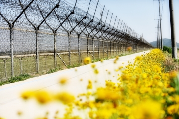 꽃이 아름답게 핀 한강 철책길. 시야 한 켠에 자리한 철조망의 모습은 여전히 쓰리다.