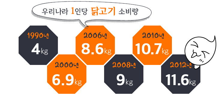 ‘사위가 오면 씨암탉을 잡아 준다’는 옛말에서도 알 수 있듯, 오래 전 닭고기는 특별한 때에나 맛볼 수 있던 귀한 먹거리였다. 그러나 요즘은 그렇지 않다. 집 밖으로 나서면 한 집 걸러 한 집 닭요리를 하는 음식점을 찾아볼 수 있을 정도로 흔해졌다. 제 아무리 한적한 시골마을일지라도 치킨집 하나쯤은 있기 마련이다. 우리나라의 1인당 닭고기 소비량은 2005년을 기점으로 쇠고기 소비량을 추월했다. 닭고기는 명실 공히 돼지고기에 이어 가장 사랑받는 육류로 자리매김했다. 국내 1인당 닭고기 소비량은 1990년대 이후 매년 조금 씩 증가하여, 지난 2012년에는 11.6kg을 기록했다. 1년 동안 한 사람당 평균 약 12~13마리의 닭을 소비한다는 소리다. 치킨, 백숙, 삼계탕, 닭복음탕, 닭똥집, 닭갈비, 찜닭, 닭칼국수… 닭을 재료로 만드는 요리 또한 그 가지 수를 헤아릴 수 없을 정도로 많아졌다. 골라먹는 재미도 있지만, 같은 음식을 매번 먹어도 질리지 않는다. ‘닭느님’의 유혹이란 언제나 치명적이다.